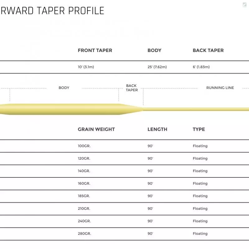 Measurements are shown below. Please note that the line weight is measured in accordance of AFTM standard, i.e. it shows the weight of the first 30 feet (9,14 m) of fly line: