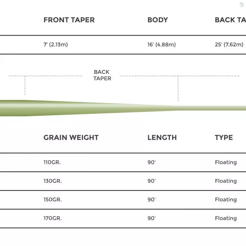 Measurements are shown below. Please note that the line weight is measured in accordance of AFTM standard, i.e. it shows the weight of the first 30 feet (9,14 m) of fly line: