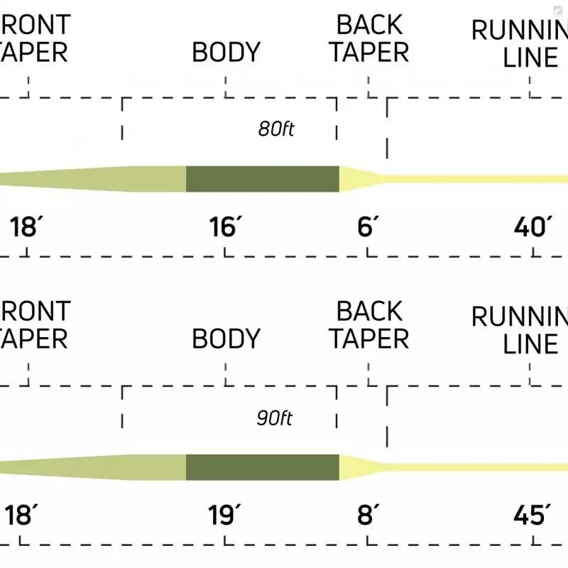 Measurements are shown below. Please note that the line weight is measured in accordance of AFTM standard, i.e. it shows the weight of the first 30 feet (9,14 m) of fly line: