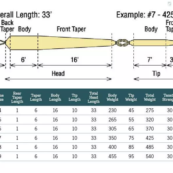 Tip Length (ft/m) | Total Line Length (ft/m) | Head Weight (grain/gram) | Tip Weight (grain/gram) |