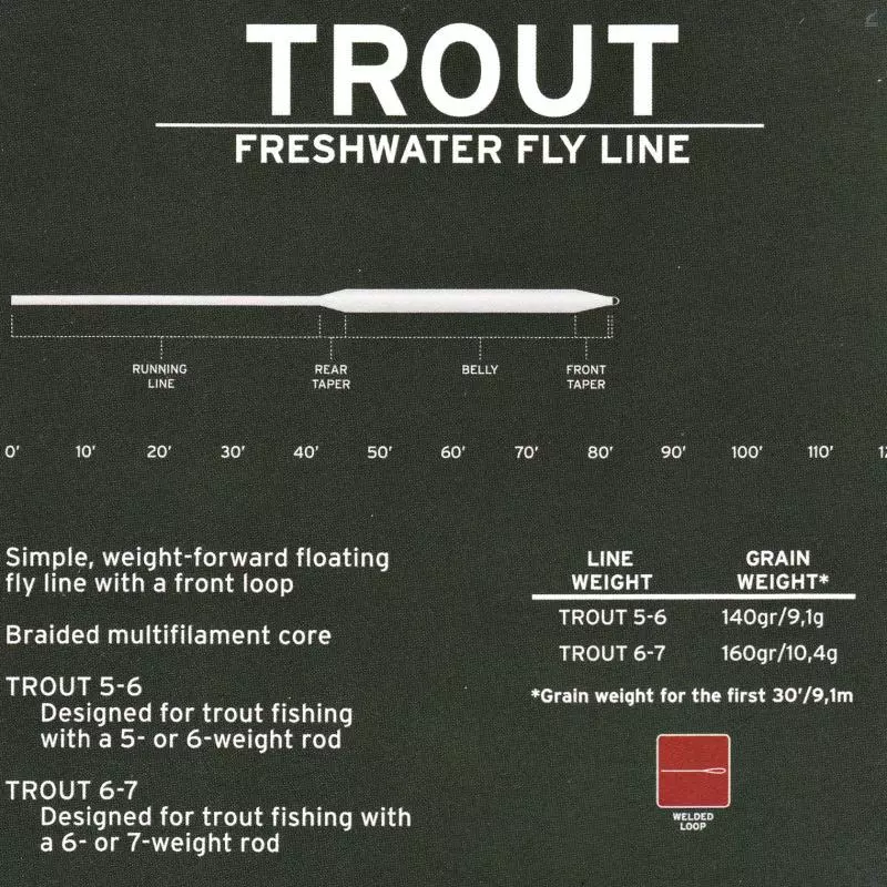 Scientific Angler’s AirCel Trout features all the properties needed in a fly line: good floatation, durability, and tapers that work well for trout, grayling and saltwater species. Trout #5/6 excels in virtually every situation where a floating fly line is needed. It works best with a #5 or #6 weight rod. Use Trout #6/7 with a #7 weight rod or fast-action #6 weight rod.