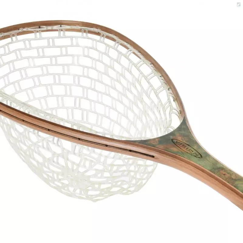 Vision Green Wood / Clear Sili Net – Wooden landing net with transparent silicone net. This landing net has a measuring marks engraved to the handle so you can quickly measure your catch before release. The shallow & transparent silicone net almost disappears when kept in water, so the fish shows well out in pictures.