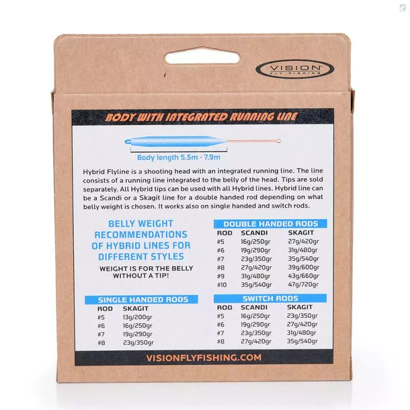 Vision Hybrid Fly Line is what you want it to be! It is a shooting head with an integrated running line. The line consists of a running line integrated into the head. Hybrid tips are sold separately. We are giving you the option to choose what you want from this line. First choose your style. Scandi, Skagit, Switch or Single Handed. Then select the proper weight of the belly for your selected style from our recommendation chart. Lastly buy a separately sold tip in the length you desire. All Hybrid tips will work on all Hybrid fly lines. You can also use Vision’s ACE T-tips.