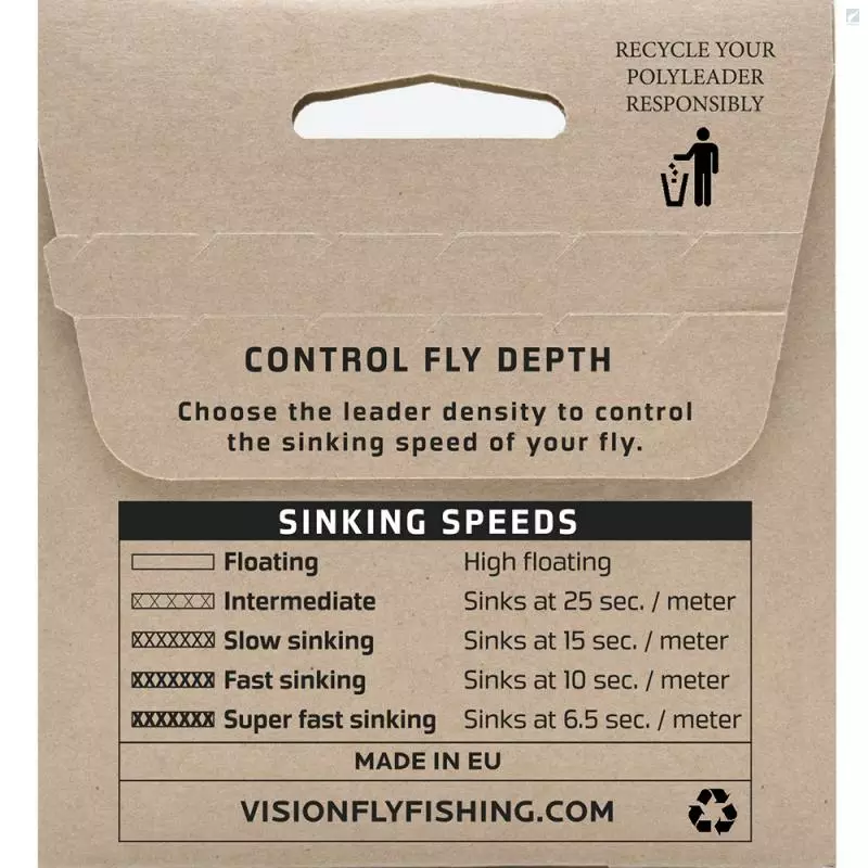 Vision Polyleader Salmon consists of a thin tapered monofilament core with a flexible polymer coating on the outside. This is why they are more durable and turn over better than normal leaders. The loop at the back end eases the change of polyleader to either floating, intermediate or sinking.